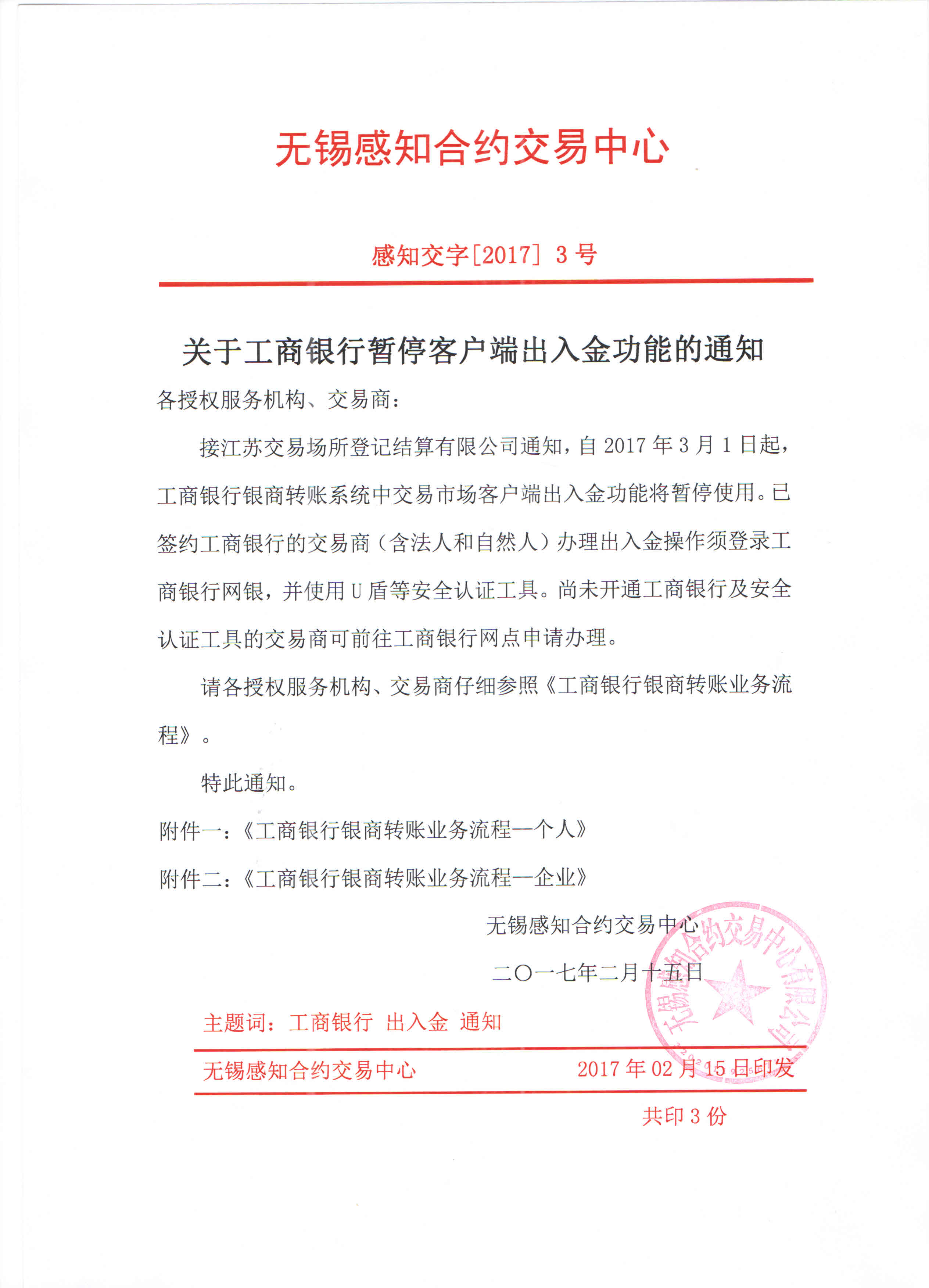 接江苏交易场所登记结算有限公司通知,自2017年3月1日起,工商银行银商转账系统中交易市场客户端出入金功能将暂停使用。已签约工商银行的交易商(含法人和自然人)办理出入金操作须登录工商银行网银,并使用U盾等安全认证工具。尚未开通工商银行及安全认证工具的交易商可前往工商银行网点申请办理。