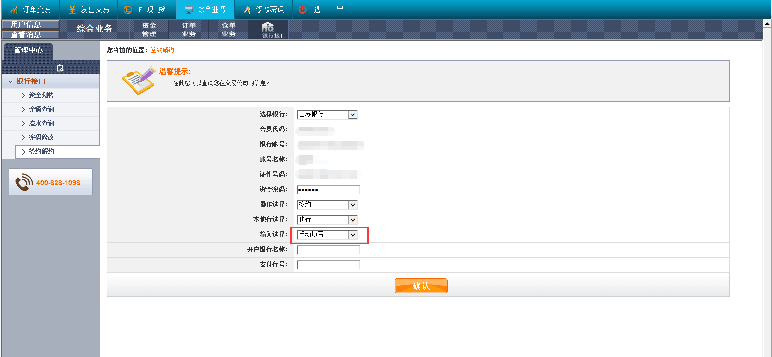 1. 系统中原有的客户需将银行信息(包括:银行账号,账户名,证件号码,开户行名称)告知交易中心客服,进行预签约信息录入;新客户直接在注册时填列相关信息;